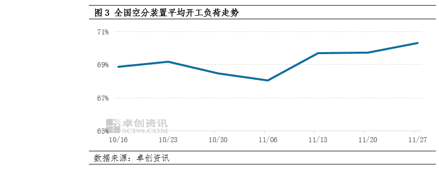 11月液氮市场供强需弱,基本面对市场支撑表现下滑。具体来看,月内空分装置恢复常态化生产,部分检修亦为常规检修,空分开工负荷上升;加之新产能释放影响,整体供应充裕。需求面受淡季氛围影响,临时性批量采购减少,终端需求刚需为主,对液氮市场支撑下滑。卓创资讯数据监测,截至11月27日,全国空分装置平均开工负荷率至70.3%,较月初上升2.24个百分点。