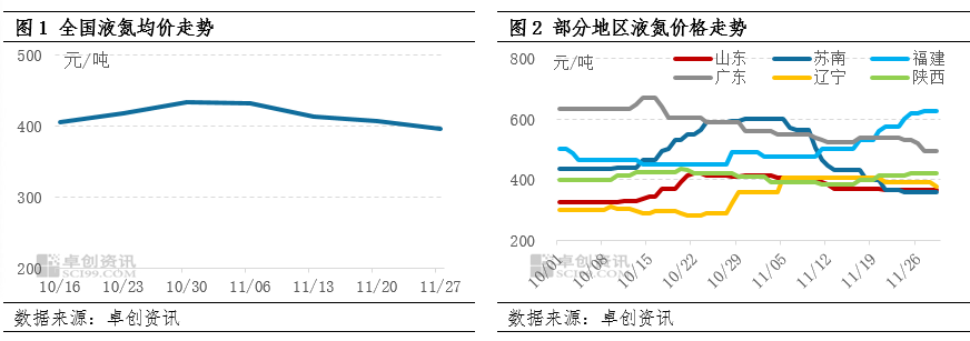 11月液氮市场供过于求,多数地区厂商出货承压,价格接连下调;仅福建以及川渝等地受主力企业装置检修、降负、采购等支撑,价格有所上行。卓创资讯(301299)数据监测,截至11月28日,全国液氮月均价至415元/吨,因月初价格基数较高,环比微涨0.8%。
