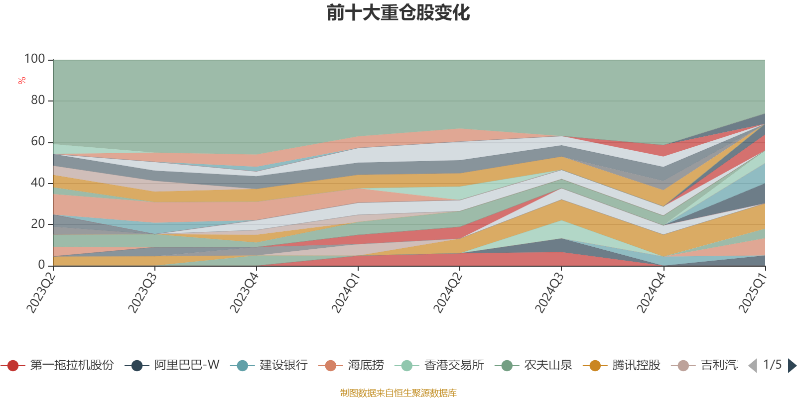 该基金持股集中度较高。截至2025年一季度末,基金十大重仓股分别是腾讯控股、泡泡玛特、康方生物、海底捞、百济神州、安踏体育、上美股份、毛戈平、阿里巴巴-W、农夫山泉。